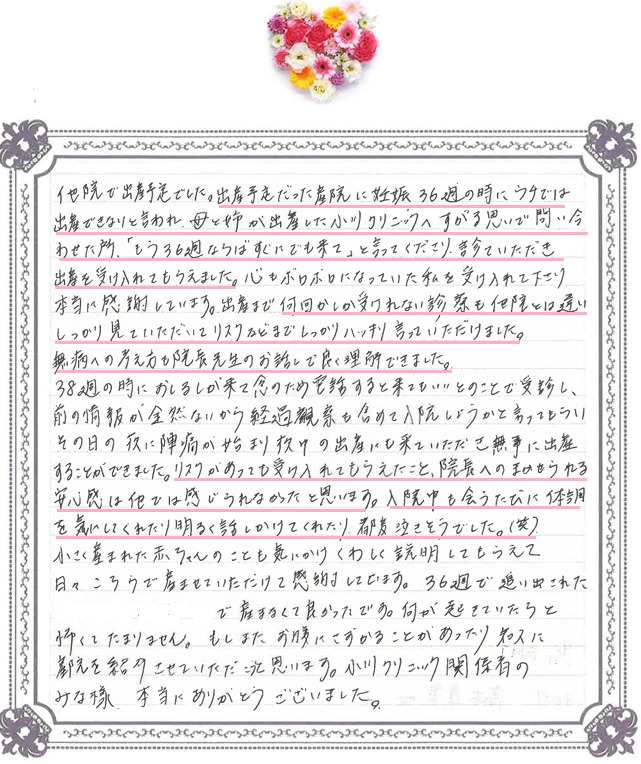 出産予定だった産院に妊娠36週の時にウチでは出産できないと言われ、 母と姉が出産した小川クリニックへすがる思いで問い合わせた所、「もう36週ならばすぐにでも来て」と 言ってくださり、診ていただき出産を受け入れてもらえました。