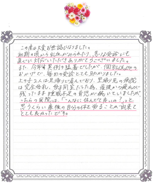 ご丁寧なお言葉をいただき、誠にありがとうございます。 猛暑の中での通院や産後のご体調など、大変な時期を少しでもお支えできたことを嬉しく思います。 今後も安心してご利用いただけるよう、スタッフ一同努めてまいります。お子さまの健やかなご成長とご家族皆さまのご健康を、スタッフ一同心よりお祈りしております。