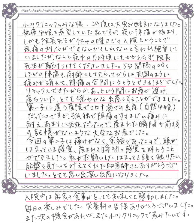 この度は心温まるお手紙を頂き、誠にありがとうございます。 ご出産という大切な瞬間を当院でお迎えいただけたこと、スタッフ一同大変嬉しく思っております。 院長をはじめ、助産師・栄養課スタッフへの温かいお言葉に深く感謝申し上げます。 今後も皆様に安心してご出産いただけるよう、より一層努めてまいります。