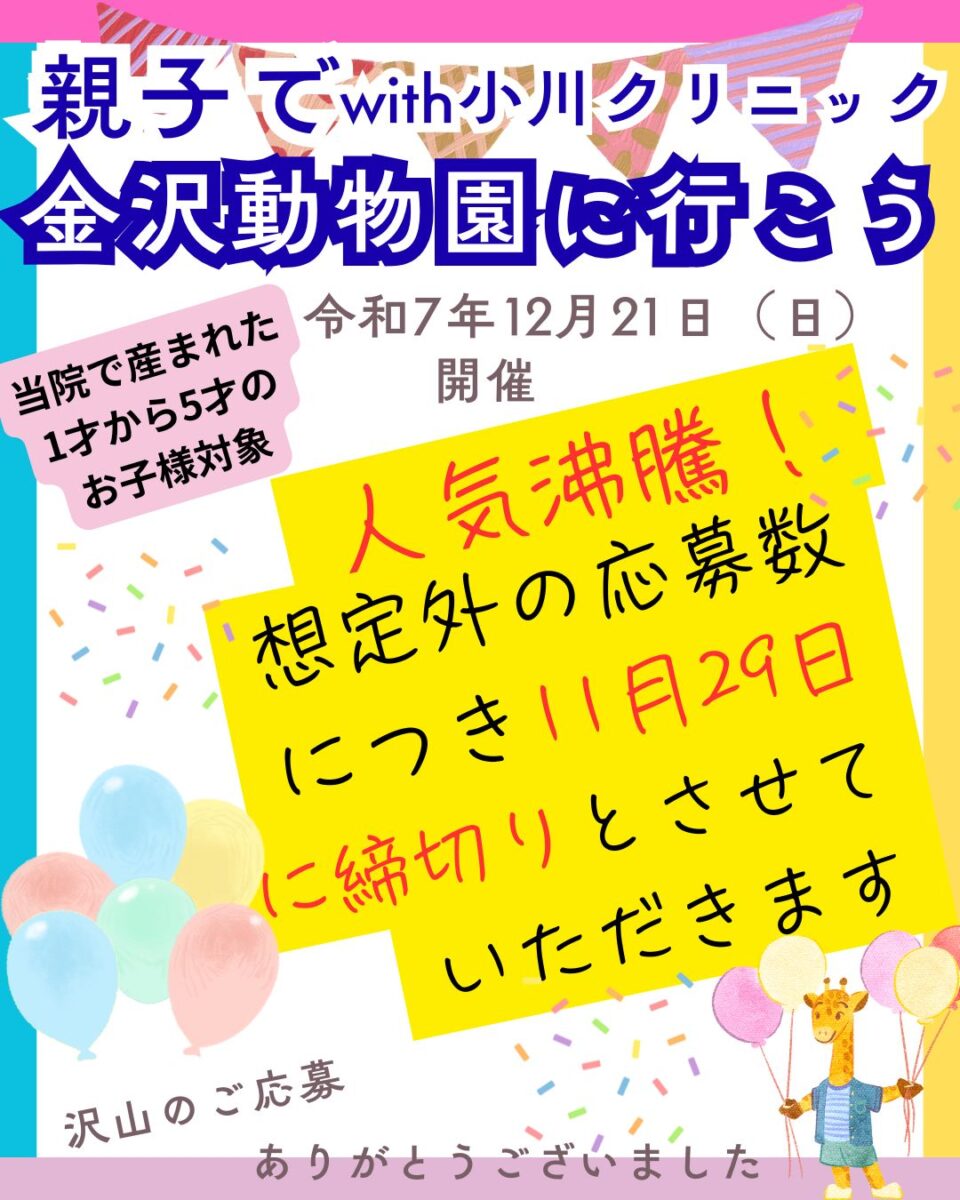 【親子で金沢動物園に行こう with小川クリニック】想定外の応募数につき11月29日に締切りとさせて いただきます
