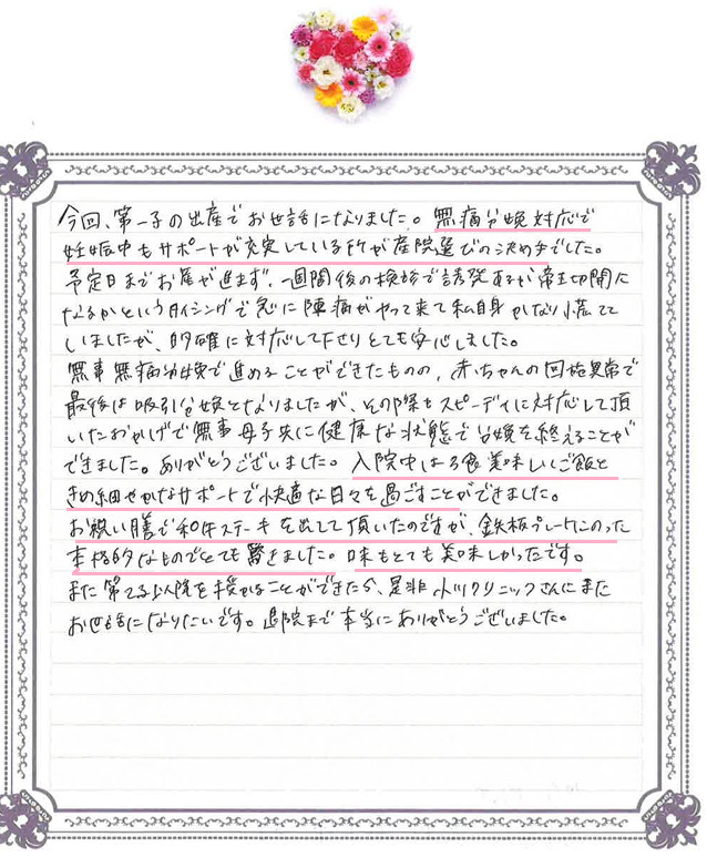 このたびは大切なご出産に際し、当院をご利用いただき誠にありがとうございました。妊娠中から分娩、そしてご入院生活まで安心してお過ごしいただけたことを大変嬉しく思います。落ち着いてお産に臨んでいただけるようサポートできたこと、また母子ともに健康な状態でご退院いただけたことは、私たちスタッフにとって何よりの喜びです。お食事やお祝い膳についてもご満足いただけたとのお言葉は、大きな励みになります。今後も皆さまに安心と快適さをご提供できるよう努めてまいります。
