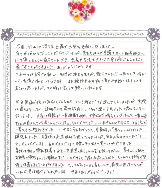 ご出産おめでとうございます。 温かいお言葉をいただき、スタッフ一同大変嬉しく拝読いたしました。 初めての妊娠・出産で安心して過ごしていただけたこと、また「赤ちゃんのために頑張れた」と感じていただけたことは、私たちにとって何よりの励みです。 今後も健診や小児科でお会いする際には、どうぞお気軽にご相談ください。赤ちゃんの健やかな成長とご家族皆さまのご健康を心よりお祈り申し上げます。