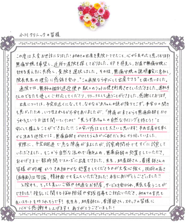 ご出産おめでとうございます。温かいお言葉をいただき、スタッフ一同大変嬉しく拝読いたしました。無痛分娩や送迎サービス、入院中の環境にご安心いただけたことは私たちの励みになります。これからも安心してお産に臨んでいただけるよう努めてまいります。ありがとうございました。