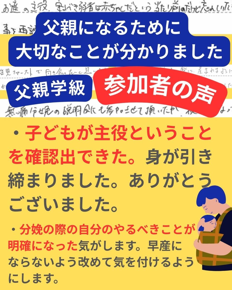 先日開催された父親学級には、たくさんのお父様がご参加くださいました。父親学級の内容に「なるほど!」「大事なことを学ぶことができました!」の声がたくさん!