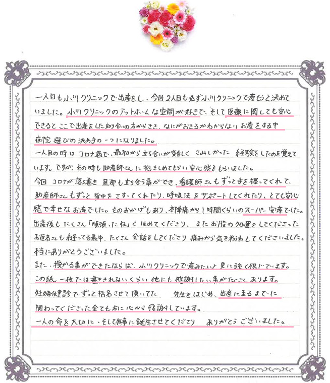 このたびは温かいお言葉をいただき、スタッフ一同心より感謝申し上げます。 お産の大切な時間を安心して過ごしていただけたこと、そしてご家族と共に幸せな瞬間を迎えられたことを私たちも大変嬉しく思います。 今後も皆さまに寄り添い、安心して出産に臨んでいただけるよう努めてまいります。 またお会いできる日をスタッフ一同楽しみにしております。