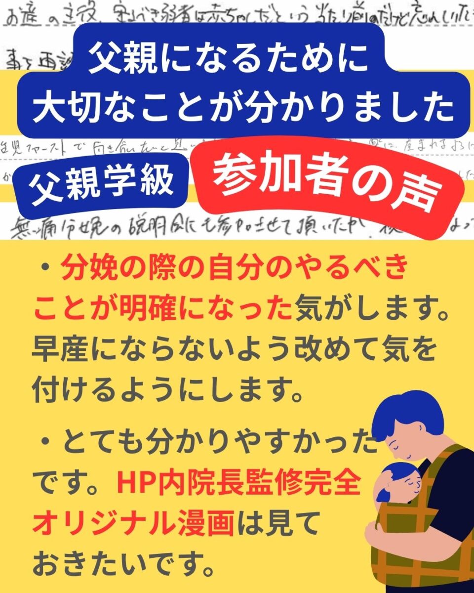 先日開催された父親学級には、たくさんのお父様がご参加くださいました。父親学級の内容に「なるほど!」「大事なことを学ぶことができました!」の声がたくさん!
