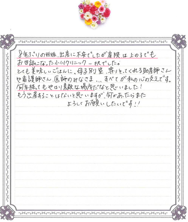 このたびはご出産おめでとうございます。 再び当院をお選びいただき、温かいお言葉を頂戴し大変嬉しく拝読いたしました。 お食事やスタッフの対応が心の支えとなったとのこと、私たちにとって何よりの励みです。 今後もご家族の健やかな毎日を心よりお祈り申し上げます。