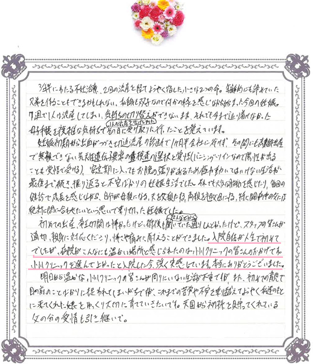 ご出産、誠におめでとうございます。 長い不妊治療や流産のご経験、妊娠中の不安や安静の日々を乗り越え、こうしてお嬢さまを迎えられたことに、心よりお祝い申し上げます。帝王切開や入院生活の中で、私たちの対応が少しでも安心につながったと感じていただけたことは、大変うれしく思います。温かいお言葉をありがとうございました。 どうか無理をなさらず、お子さまとの時間を大切にお過ごしください。 私たちスタッフ一同、これからのご家族の健やかな日々を心よりお祈りしております。