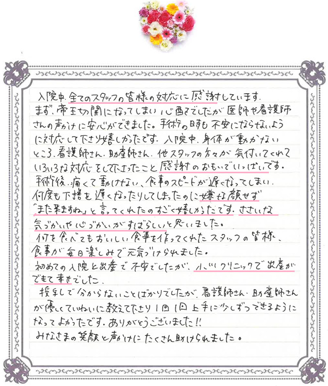 この度は心温まるお言葉をお寄せいただき、誠にありがとうございます。初めてのご入院とご出産でご不安も多い中、当院のスタッフの対応が少しでも安心につながったとのこと、大変嬉しく拝読いたしました。また、食事や授乳指導についても温かいお言葉を頂戴し、関わったスタッフ全員の大きな励みとなります。これから始まる子育てが、穏やかで幸せな時間となりますよう心より願っております。またお会いできる日を楽しみにしております。この度はご出産、本当におめでとうございました。