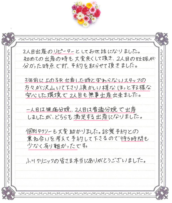 この度は温かいお言葉をお寄せいただき、誠にありがとうございます。 お二人目のご出産でも当院をお選びいただき、無事にお迎えできましたことをスタッフ一同大変うれしく思っております。 久しぶりのご来院でも安心してお過ごしいただけたとのこと、また無痛分娩・通常分娩どちらもご満足いただけたとのお声は、私たちにとって大きな励みです。 個別タクシーサービスもお役に立てたようで何よりです。 今後もご家族の健康を心よりお祈り申し上げます。またお会いできる日を楽しみにしております。