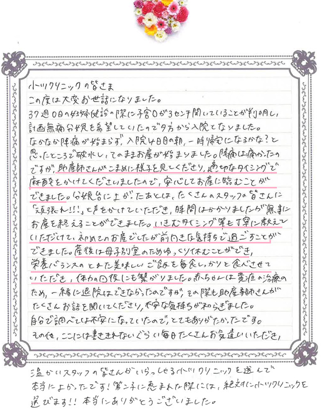 この度は、温かいお言葉をお寄せいただき、心より感謝申し上げます。お産の経過の中で、少しでも安心してお過ごしいただけたこと、そしてスタッフの関わりが支えになったとのお言葉を大変うれしく拝読しました。初めてのお産を前向きな気持ちで迎えられたとのこと、私たちにとって何よりの励みです。 産後のお食事やお休みの時間も回復に役立ったとのことで安心いたしました。またお会いできる日を楽しみにしております。ご出産、本当におめでとうございます。どうぞお身体を大切にお過ごしください。