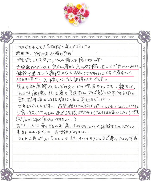 この度は温かいお言葉をお寄せいただき、誠にありがとうございます。 数ある施設の中から当院をお選びいただき、また大切なお産をお任せいただけたことを大変光栄に思っております。 スタッフ一同、安心してお過ごしいただけたこと、そしてお食事まで喜んでいただけたことをとても嬉しく拝読いたしました。 今後も皆さまに寄り添い、心地よい環境づくりに努めてまいります。 お母さま、ご家族の皆さまのご健康とご多幸を心よりお祈り申し上げます。 またお会いできる日をスタッフ一同楽しみにしております。