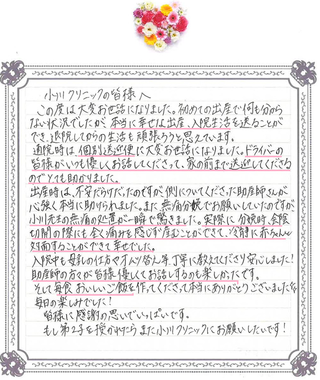 小川クリニックをご利用いただき、温かいお言葉をお寄せくださり誠にありがとうございます。 初めてのご出産という大切な時間を、安心してお過ごしいただけたとのこと、スタッフ一同大変うれしく拝読いたしました。 送迎、分娩、入院生活の中でお力になれたことを光栄に思います。 また、無痛分娩や助産師のサポートについてもお褒めの言葉をいただき、心より感謝申し上げます。