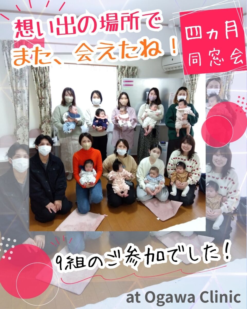 小川クリニックではご一緒の時期にご入院、ご出産されたママと赤ちゃんの再会の場として、同窓会を開催しています。まだまだママになって四か月。赤ちゃんとの生活に日々翻弄されていることも多い時期☆この同窓会は同じ月齢の赤ちゃんの子育てをするママ同士情報交換をしたり、日頃の悩みを共有し、おしゃべりを楽しんだり、ママ友づくりができる場としてママさんに人気のイベントです!