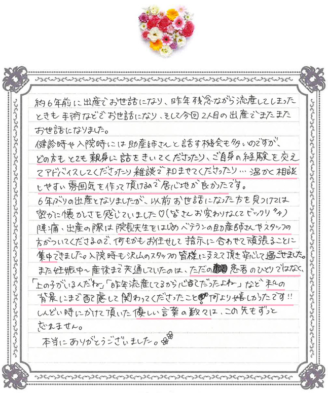 このたびは温かいお言葉をお寄せいただき、誠にありがとうございます。 6年ぶりのご出産、そしてこれまでのさまざまなご経験の中で、再び当院をお選びいただけたことを大変うれしく思っております。 スタッフ一同、少しでも安心してお過ごしいただけるよう努めておりますので、そのように感じていただけたことが何よりの励みです。 お子さまのご誕生、心よりお祝い申し上げます。どうぞご無理のないよう、産後の生活をお過ごしください。改めまして、この度は本当におめでとうございます。