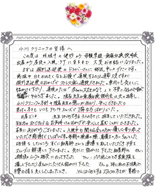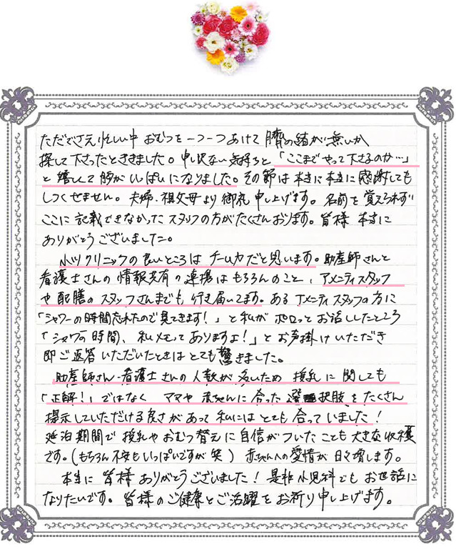 この度は温かいお言葉をお寄せいただき、誠にありがとうございます。 妊娠中の通院からご出産、入院中のケアに至るまで、当院スタッフがお力になれたことを大変嬉しく思います。 送迎便のご利用や、医師・助産師・看護師・受付・アメニティスタッフなど、関わったスタッフへの励みとなるお言葉に深く感謝申し上げます。 ご入院中のサポートが安心につながったとのこと、スタッフ一同の何よりの喜びです。 改めまして、心温まるメッセージをありがとうございました。 皆様のご健康とご多幸をお祈り申し上げます。