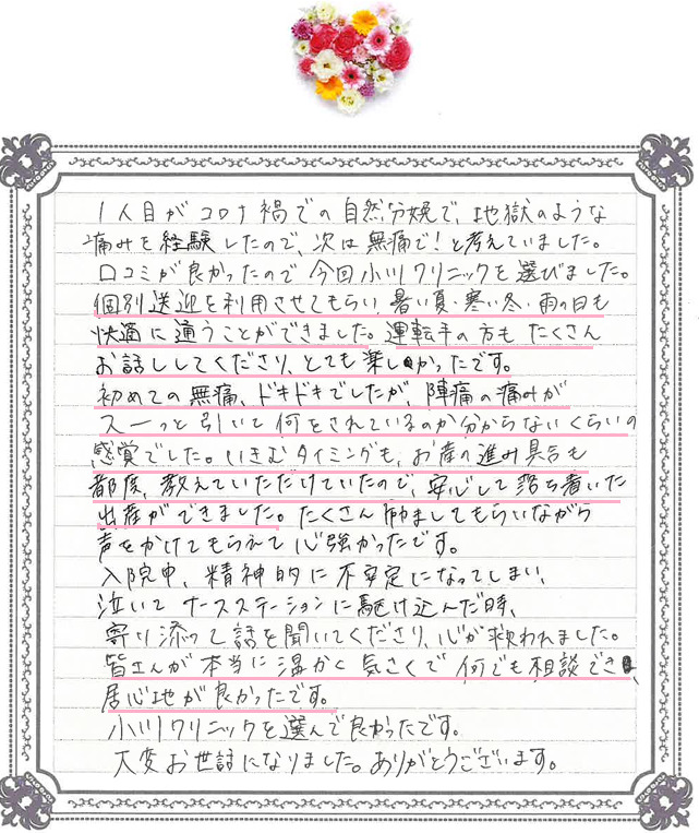 この度は温かいご感想をお寄せいただき、誠にありがとうございます。 無痛分娩が安心して迎えられたこと、また送迎や入院中のサポートについてもお褒めの言葉を頂戴し、スタッフ一同大変励みになっております。 今後も皆さまに寄り添い、安心してお過ごしいただける環境づくりに努めてまいります。 こちらこそ、大切なご出産をお任せいただきありがとうございました。