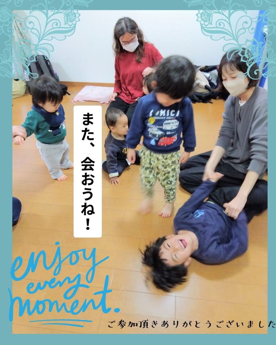 慣れるまで涙が出る時間もありましたが、全体としては穏やかであたたかい雰囲気で子どもたちはのびのびと仲良く遊んでいました。また、3才と5才のお兄ちゃんも参加してくれ、とても元気で優しく、 会の雰囲気を明るくしてくれました。