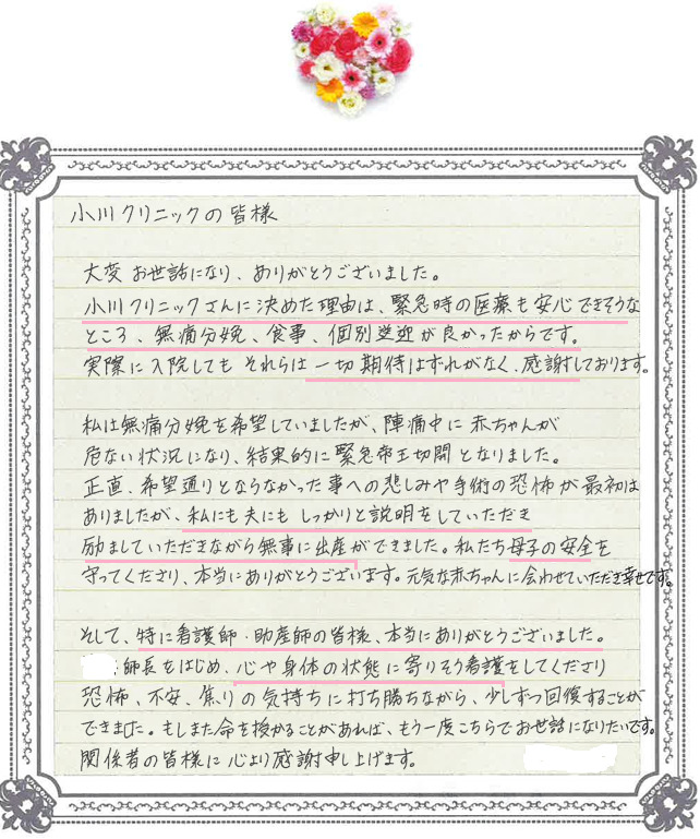 この度は温かいお言葉をお寄せいただき、誠にありがとうございます。 無事にお子さまをお迎えいただけたこと、スタッフ一同心より嬉しく思っております。 緊急のご対応となりましたが、お母さまと赤ちゃんの安全を第一に無事に出産に至れたことを、このようにお伝えいただき大変励みになります。 また、看護師・助産師をはじめとするスタッフへのお言葉にも深く感謝申し上げます。 今後も安心してお過ごしいただける医療を提供できるよう努めてまいります。 ご家族皆さまの健やかな毎日を心よりお祈り申し上げます。