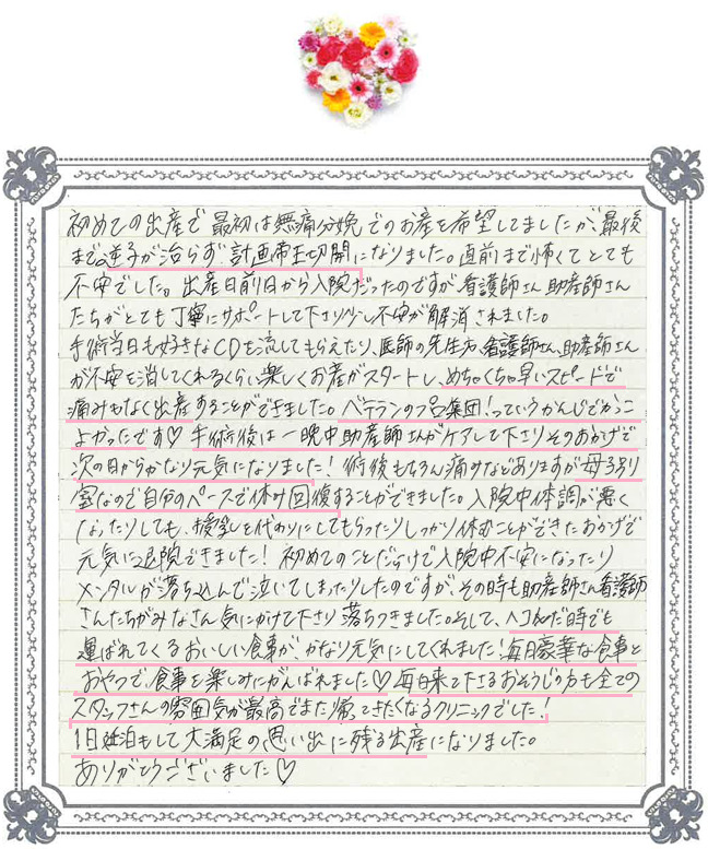 この度は温かいお言葉をお寄せいただき、誠にありがとうございます。 初めてのご出産で不安も多い中、無事にお子さまをお迎えいただけたことをスタッフ一同大変嬉しく思っております。手術前後のサポートや入院中のケアについて、このようにお言葉をいただけたことは大きな励みになります。 今後も安心してお過ごしいただける環境づくりに努めてまいります。 ご家族皆さまの健やかな毎日を心よりお祈り申し上げます。
