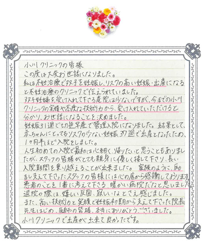 小川クリニックをご利用いただき、温かいお言葉をお寄せくださり誠にありがとうございます。 長期のご入院はご不安も多かったことと思いますが、無事、ご出産を迎えられたこと、スタッフ一同大変うれしく思っております。 お二人の赤ちゃんとご家族の皆さまのこれからの健やかな日々を心よりお祈り申し上げます。