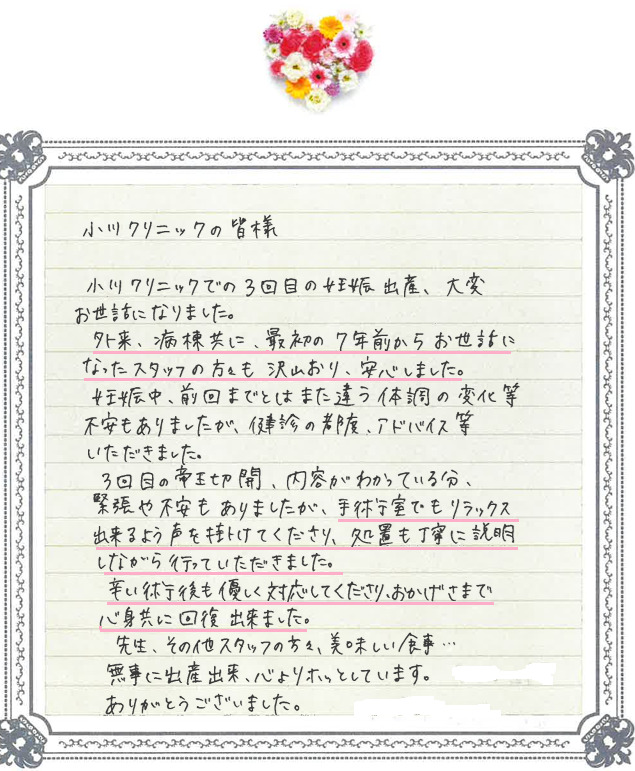 小川クリニックでの3回目の妊娠出産、大変お世話になりました。外来、病棟共に、最初の7年前からお世話になったスタッフの方々も沢山おり、安心しました。