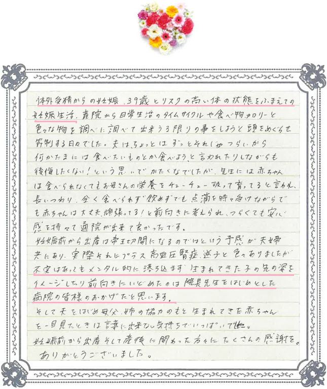 体外受精からの妊娠、39歳とリスクの高い体の状態をふまえての妊娠生活~不安があってもメンタル的に落ち込まず、生まれてくる子の先の姿をイメージしたり前向きにいられたのは、院長先生をはじめ病院の皆様のおかげだと思います。