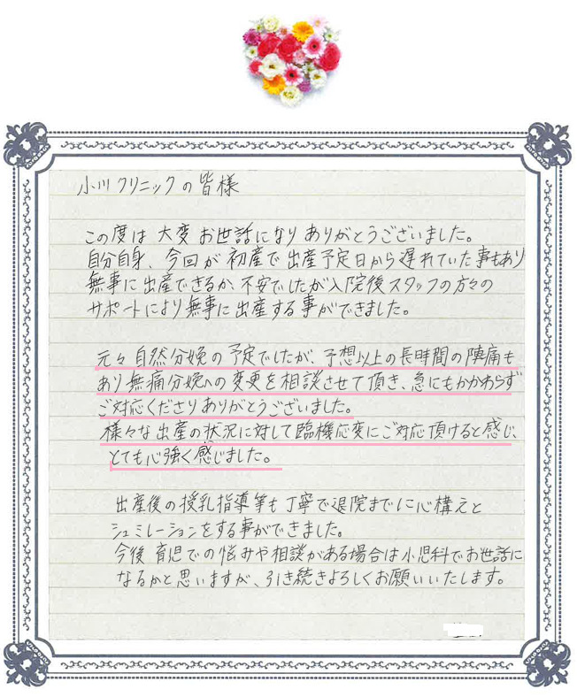 小川クリニックでございます。 この度は温かいお言葉をお寄せいただき、誠にありがとうございます。 ご出産が無事に終えられたとのこと、スタッフ一同大変うれしく思っております。 分娩方法の変更や入院中のサポートが、お力になれたのであれば何よりです。 今後の育児につきましても、小児科を含めスタッフ一同でしっかりとサポートしてまいりますので、どうぞお気軽にご相談ください。 改めまして、ご出産おめでとうございます。 今後ともよろしくお願いいたします。