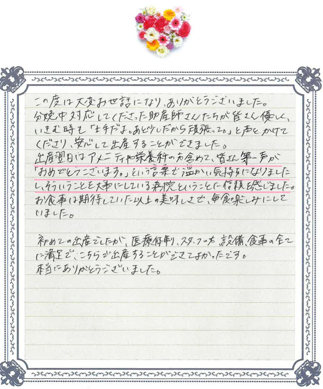 この度は温かいお言葉をお寄せいただき、誠にありがとうございます。 初めてのご出産を安心して迎えていただけたこと、スタッフ一同大変うれしく思っております。 今後も皆さまに寄り添ったケアを提供できるよう努めてまいります。 お身体の回復を第一に、どうぞご自愛ください。 またお会いできる日をスタッフ一同心よりお待ちしております。