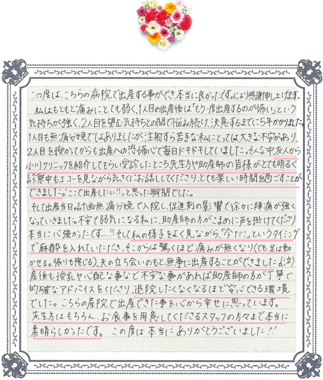 この度は温かいお言葉をお寄せいただき、誠にありがとうございます。 出産という大きな出来事に際し、当院をお選びいただけたこと、そして安心してお過ごしいただけたことをスタッフ一同大変うれしく思っております。 産後の時間も安心してお過ごしいただけたとのこと、励みになるお言葉をありがとうございました。 これからのご家族の健やかな毎日を心よりお祈り申し上げます。