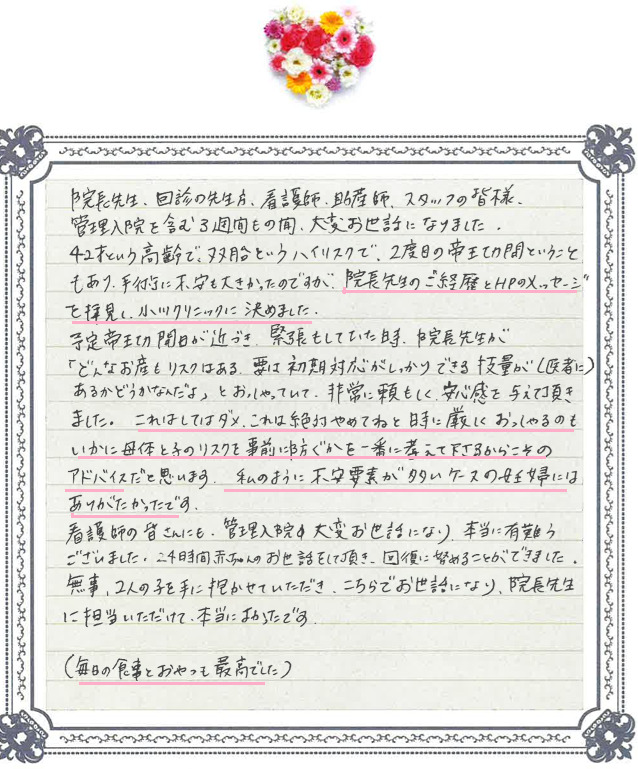 この度は温かいお言葉をお寄せいただき、誠にありがとうございます。 ご出産が無事に終わり、お母さま・お子さま共に元気にお過ごしとのこと、スタッフ一同大変うれしく拝見いたしました。 入院中の生活や手術において、少しでも安心してお過ごしいただけたのであれば何よりです。 お二人のお子さまの健やかな成長を心よりお祈り申し上げます。